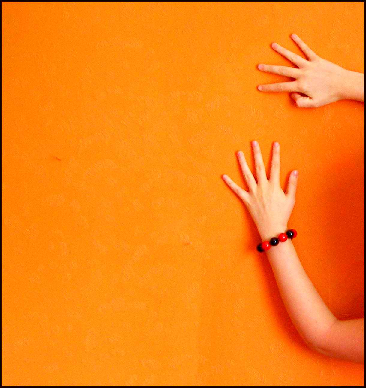 homely feeling as flowers in a vase on the bookshelf, or a bright orange wall, partially covered with paintings